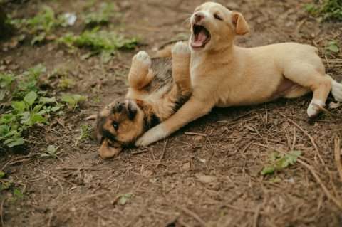 Zwei spielende Hunde auf einer Wiese